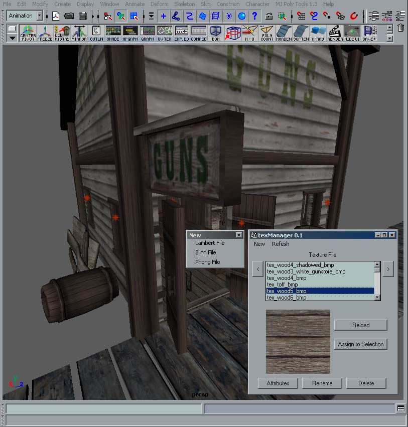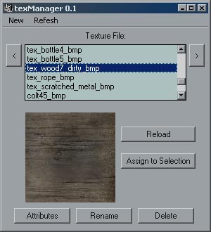 A texture manager utility for Maya 4.0 to make several things more convenient for texturing scenes. Automatically creates shaders and names them after the file. Also has texture previews and assigning textures can also be done from here. I use this instead of hypershade for simple file texturing of scenes.
